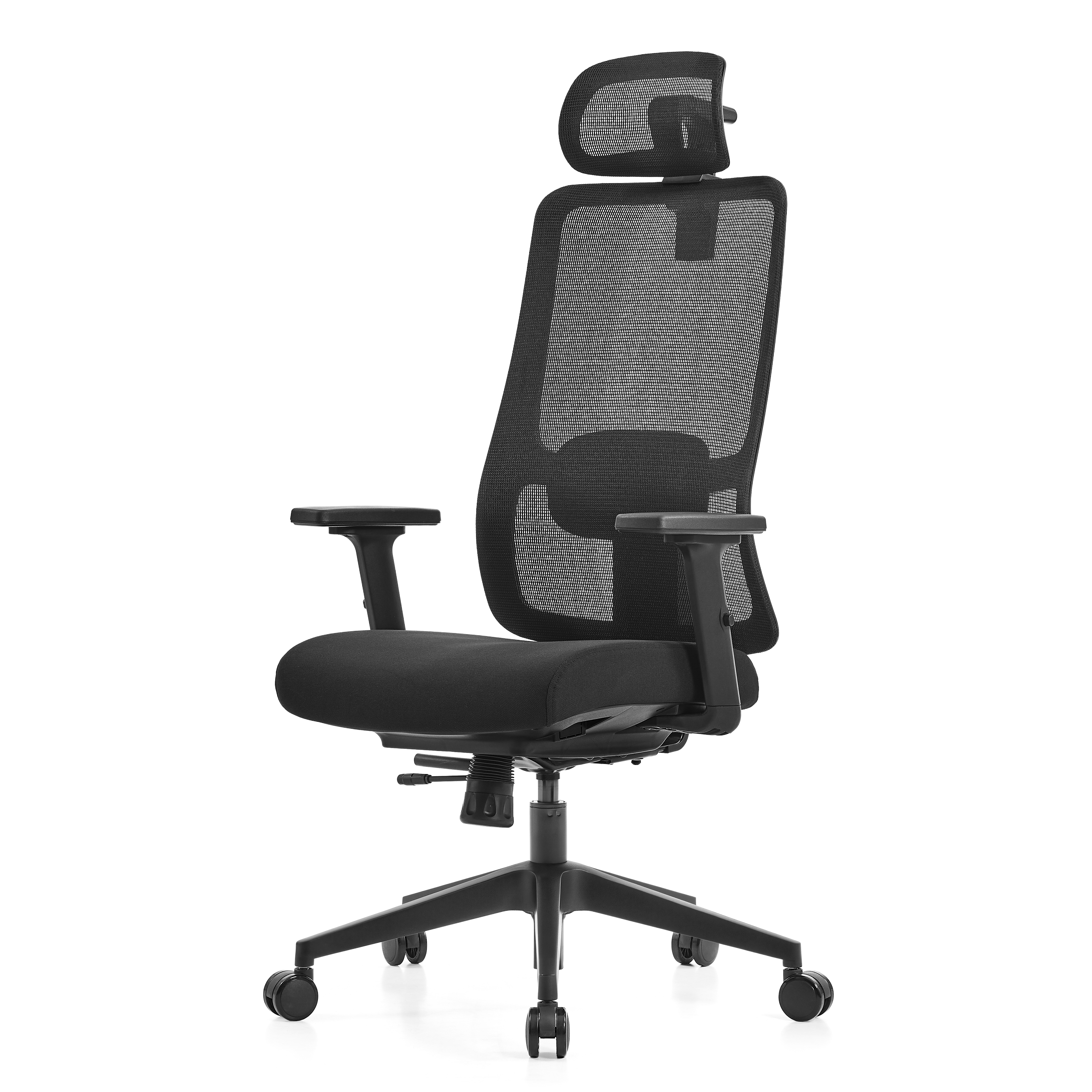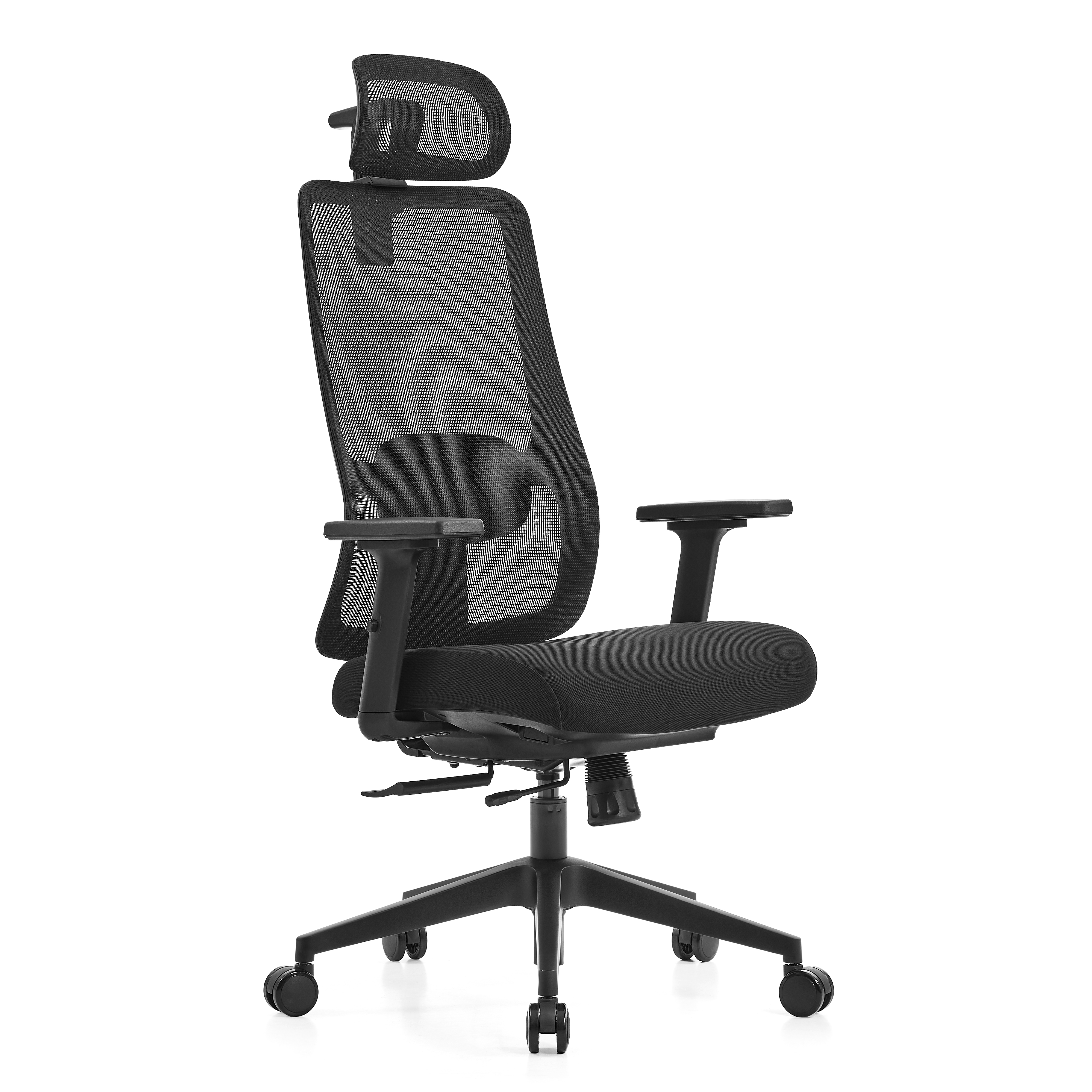 Ergonomsko sedišče je izdelano iz viskoko kakovostne lite pene, oblazinjeno s trpežnim črnim blagom, kar zagotavlja prijeten občutek in dolgotrajno udobje. Hrbtišče in naslon za glavo v mreži zagotavljata odlično zračnost in svežino tudi po več urah sedenja. Nylon podnožje in gumirana kolesa omogočata stabilnost, tiho premikanje in varnost na vseh površinah.