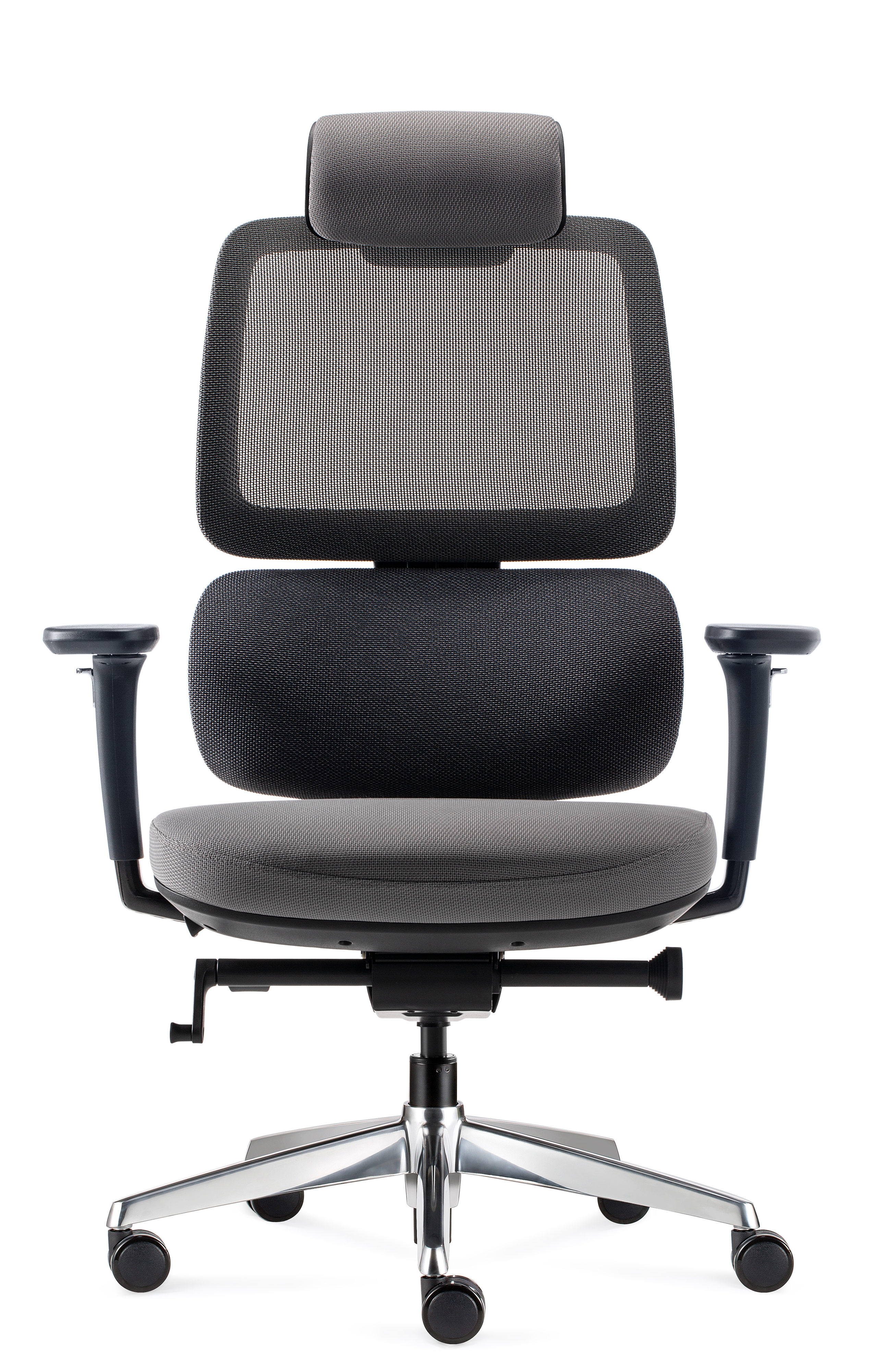- nastavljiv ergonomski hrbet po višini, oblazinjen v visoko odporni sivi mreži s poudarjeno ledveno oporo, ki je mehko oblazinjena